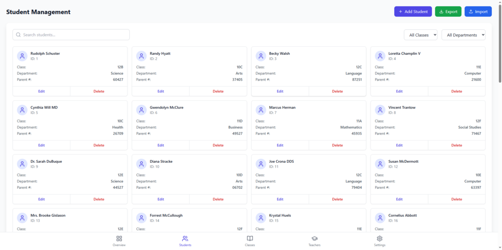 Homeroom teachers can manage student data within their own class, while subject teachers have read-only access. Headmasters can manage teachers and students across the board. Filtering options by class, level, department, and attendance status make navigating student data seamless. -