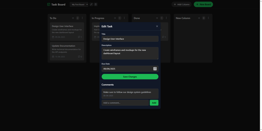 Tasks can include titles, descriptions, and due dates. A modal interface allows editing and detailed views, while drag-and-drop interaction enables smooth movement across columns. Each task also tracks its creation date, helping you monitor progress over time.